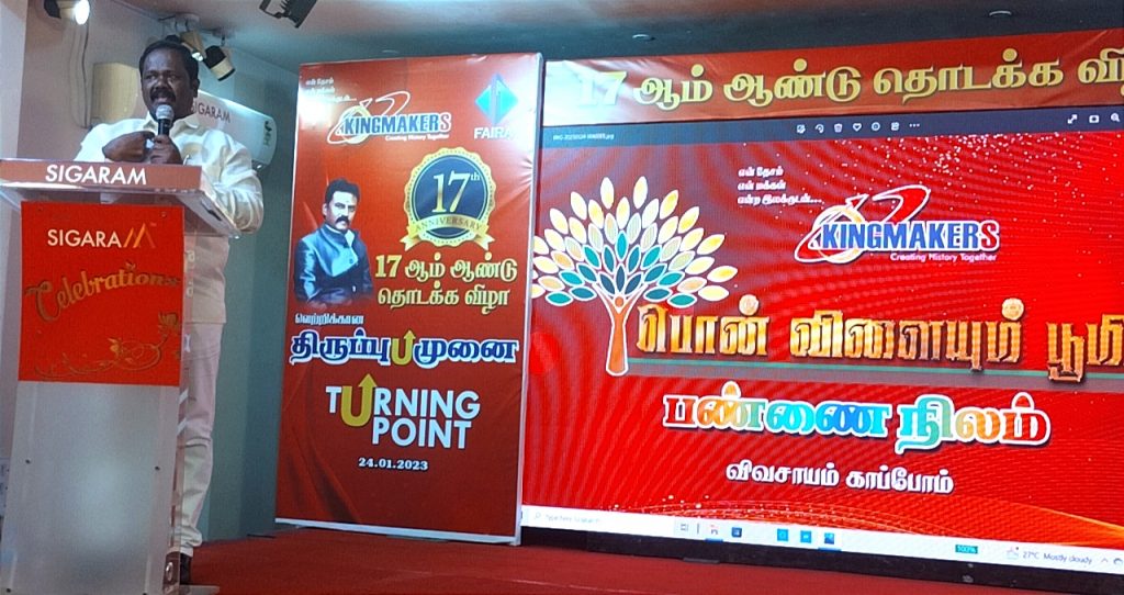 மேலும் இவ்விழாவில் கிங்மேக்கர்ஸ் நிறுவனத்தின் “பொன் விளையும் பூமி” பண்ணை நிலம் திட்டம் தொடங்கப்பட்டது.