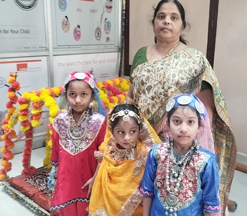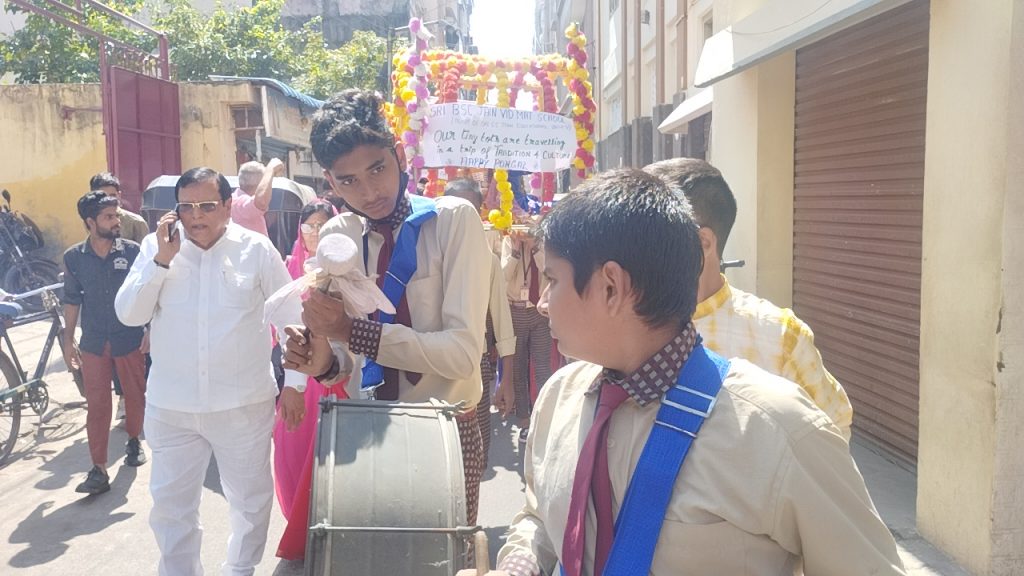 வர்ணங்கள் பூசப்பட்ட அழகான மாட்டு வண்டி மற்றும் மலர்களால் அலங்கரிக்கப்பட்டிருந்த பல்லக்குகளில் மாணவச் செல்வங்கள் அமர வைக்கப்பட்டு வீதிகளில் ஊர்வலமாக அழைத்து செல்பட்டனர்.