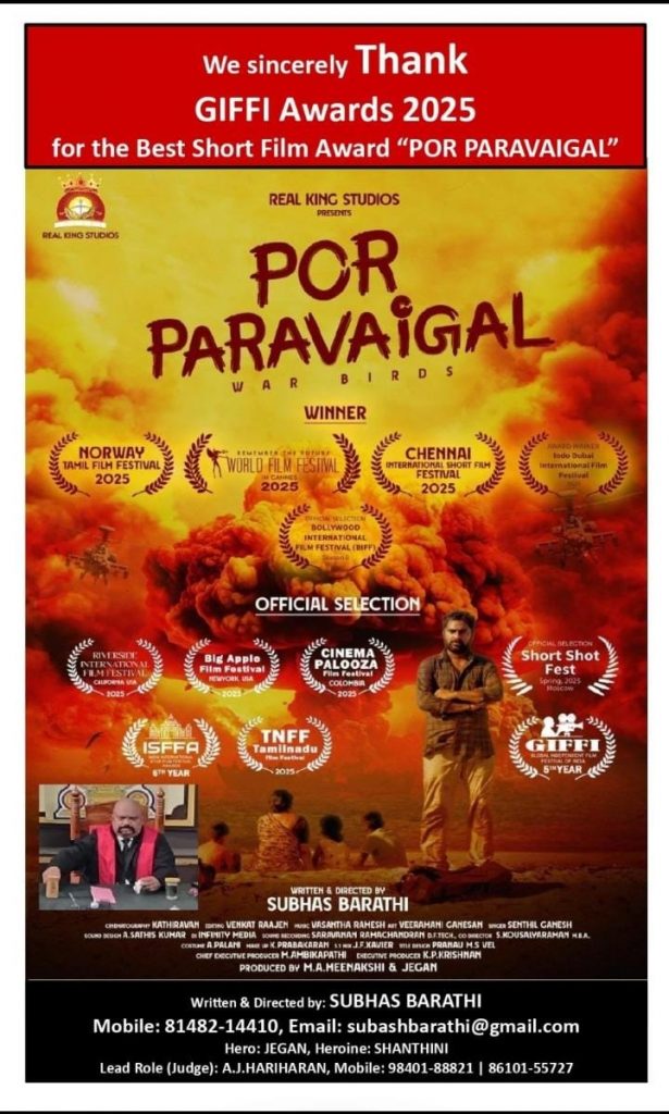சர்வதேச அளவில் பாராட்டைப் பெற்ற தமிழ் குறும்படமான “போர் பறவைகள்” (Por Paravaigal / War Birds), எழுதி இயக்கிய சுபாஷ் பாரதி அவர்கள் எழுதி இயக்கிய இந்த குறும்படத்திற்கு கொல்கத்தா சுவாமி விவேகானந்தா அரங்கில் நடைபெற்ற 7வது உலக சுயாட்சி திரைப்பட விழா (GIFFI Awards 2025)-இல் கௌரவிக்கப்பட்டது.