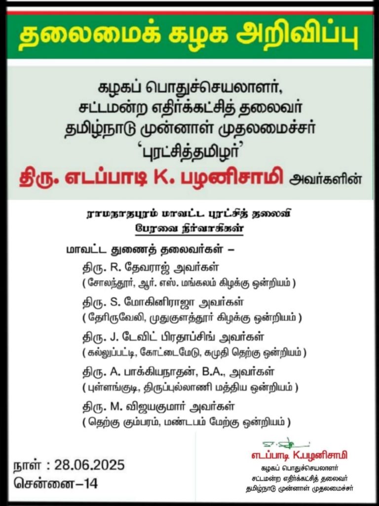 இராமநாதபுரம்: அஇஅதிமுக பொதுச் செயலாளர் எடப்பாடி கே. பழனிச்சாமி அவர்கள் இராமநாதபுரம் மாவட்டத்தில் புரட்சித்தலைவி அம்மா பேரவை நிர்வாகிகளை நியமனம் குறித்த அறிவிப்புகளை வெளியிட்டிருந்தார்.