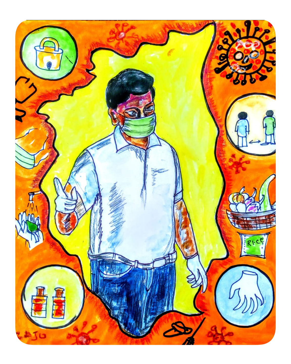 பொது ஊரடங்கு காலகட்டத்தில் நாம் பின்பற்ற வேண்டிய அனைத்து விதமான சுகாதார முறைகளும்,சமூக நடத்தைகளை குறித்து தெளிவாக சொல்வதே இந்த ஒவியத்தின் தனி சிறப்பாகும்.