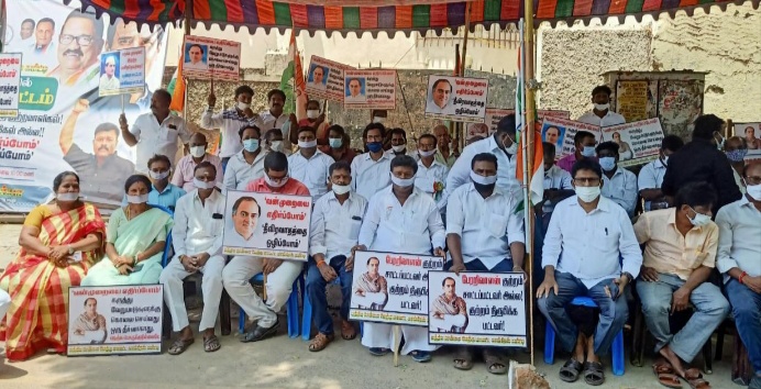 எம்.பி. ரஞ்சன் குமார் அவர்கள் தலைமையில் வாயில் வெள்ளை துணி கட்டிக்கொண்டு வேப்பேரி காவல் நிலையம் எதிரில் உள்ள ராஜீவ் காந்தி சிலை அருகில் அமைதியான முறையில் மவுன அறவழி போராட்டம் நடைபெற்றது.