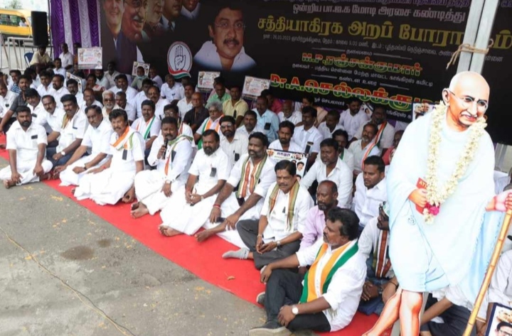 ராகுல் காந்தி அவர்களின் எம். பி பதவியை நீக்கம் செய்யப்பட்டதை கண்டித்து மத்திய சென்னை மேற்கு மாவட்ட காங்கிரஸார் சத்தியாகிரக அறவழிப்போராட்டம்!