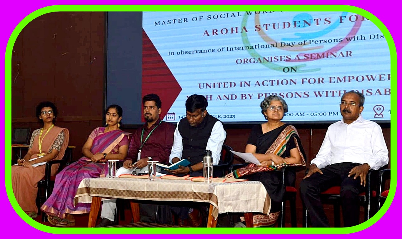 சென்னை சமூகப்பணிக் கல்லூரியின் முதுநிலை சமூகப்பணித் துறையின் மாற்றுத்திறனாளிகள் மற்றும் அதிகாரமளித்தல் துறை மற்றும் மாணவர் மன்றமான ‘அரோகா’வும் இணைந்து மாற்றுத்திறனாளிகளுக்கான கருத்தரங்கம் கல்லூரி வளாக அரங்கில் நடைப்பெற்றது.