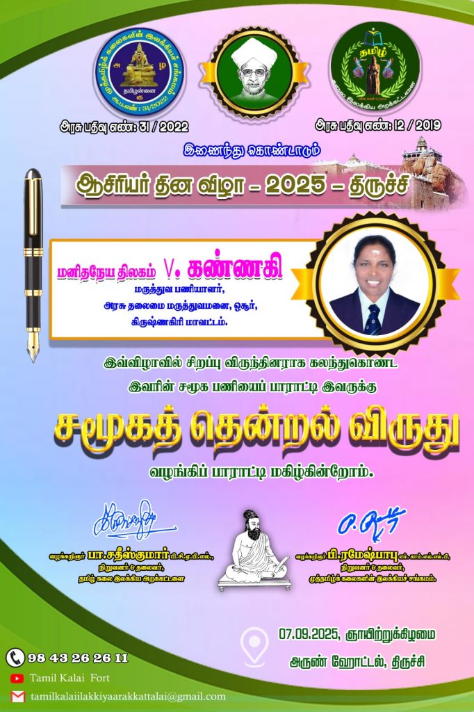திருச்சி: தமிழ் கலை இலக்கிய அறக்கட்டளை மற்றும் முத்தமிழ் கலைகளின் இலக்கிய சங்கமம் இணைந்து நடத்திய ஆசிரியர் தினவிழா மற்றும் விருது வழங்கும் நிகழ்ச்சி திருச்சி அருண் ஹோட்டல் சுமங்கலி மஹாலில் தமிழ் கலை இலக்கிய அறக்கட்டளை நிறுவனர் தலைவர் மற்றும் வழக்கறிஞர் கரூர் பா. சதீஷ் அவர்கள் தலைமையில் நடைப்பெற்றது.