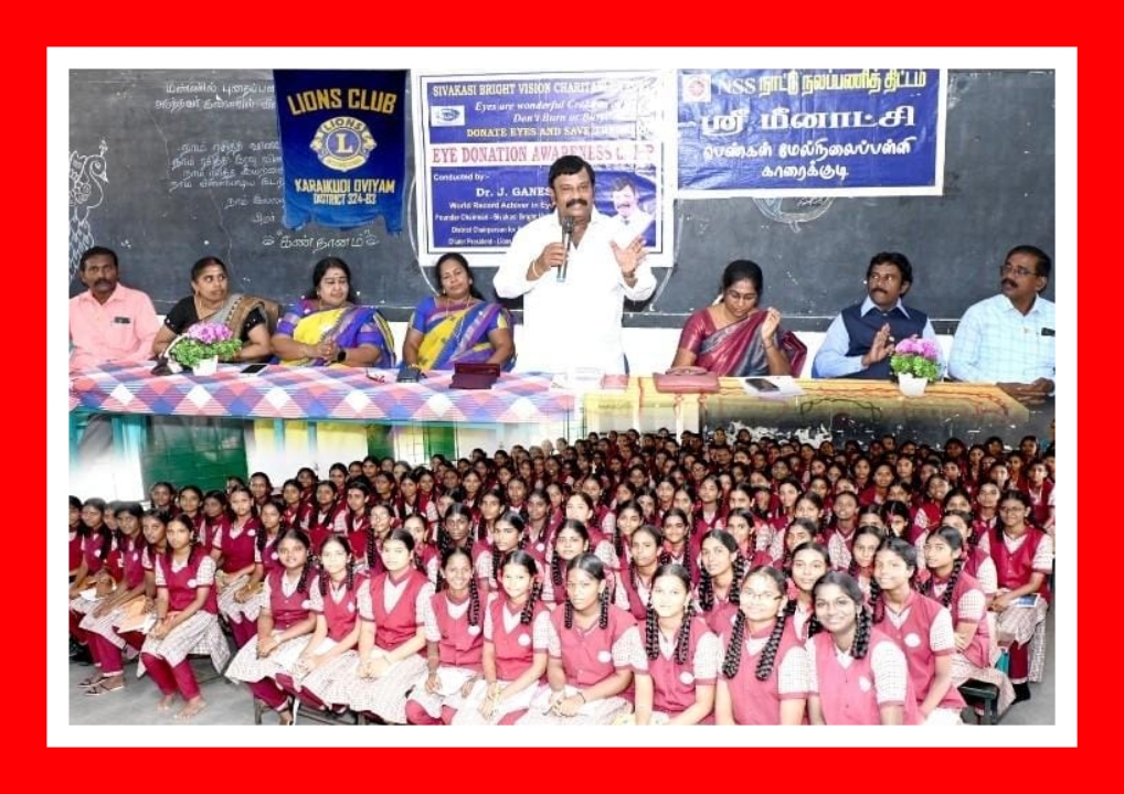 சிவகாசி பிரைட் விஷன் சாரிட்டபிள் டிரஸ்ட், சிவகாசி பட்டாஸ் நகர் அரிமா சங்கம், காரைக்குடி ஓவியம் அரிமா சங்கமும் இணைந்து காரைக்குடி ஸ்ரீமீனாட்சி பெண்கள் மேல்நிலைப்பள்ளியில் கண்தான விழிப்புணர்வு முகாம் கல்லூரி வளாகத்தில் நடைப்பெற்றது.