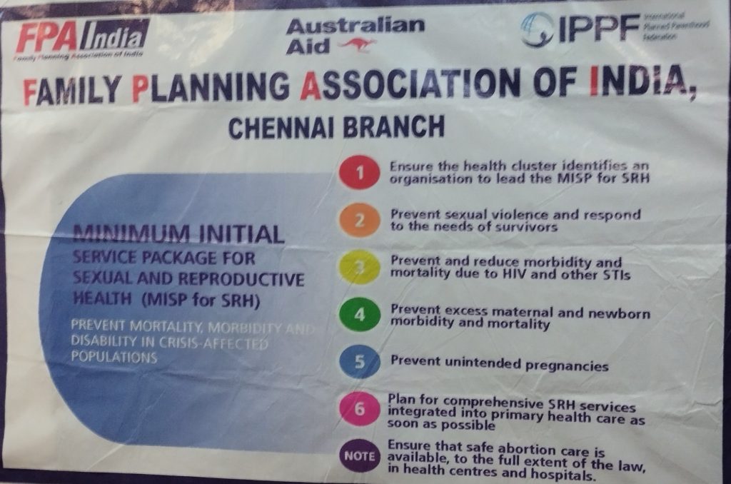 In order to protect the Reproductive health of the affected population, during calamities, the Association is implementing a project called MISP (Minimum initial service package) in collaboration ith like-minded NGOs. We have so far signed MOUs with 3 like-minded NGOs.
