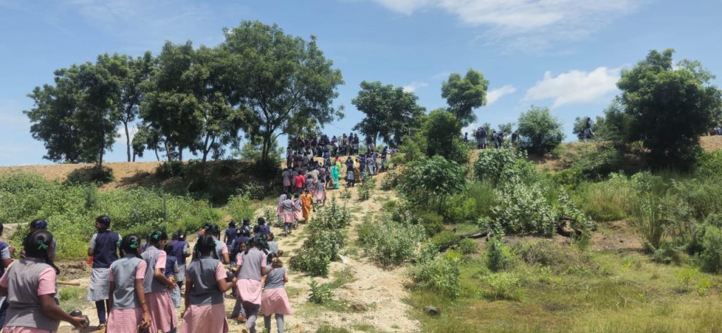 இதில் 2.5 கிலோ மீட்டர் தொலைவிற்கு 320 அரசு பள்ளி மாணவிகள் பனை விதைகளை நட்டனர்.