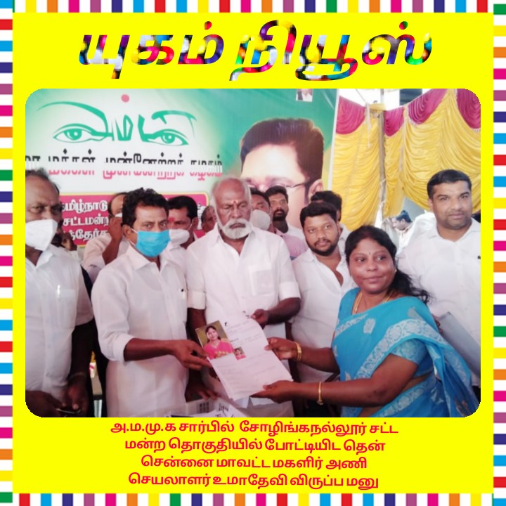 அம்மா மக்கள் முன்னேற்ற கழகத்தின் சார்பில் சோழிங்கநல்லூர் சட்டமன்ற தொகுதியில் போட்டியிடுவதற்காக தென் சென்னை மாவட்ட மகளிர் அணி செயலாளர் எஸ்.வி.உமாதேவி அவர்கள் இராயப்பேட்டையி லுள்ள அ.ம.மு.க. தலைமைக் அலுவலகத்தில் கழக பொறுப்பாளர்களிடம் விருப்ப மனு அளித்தார்.