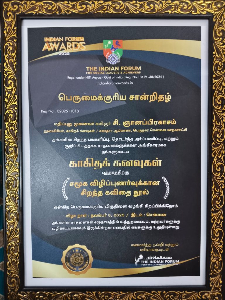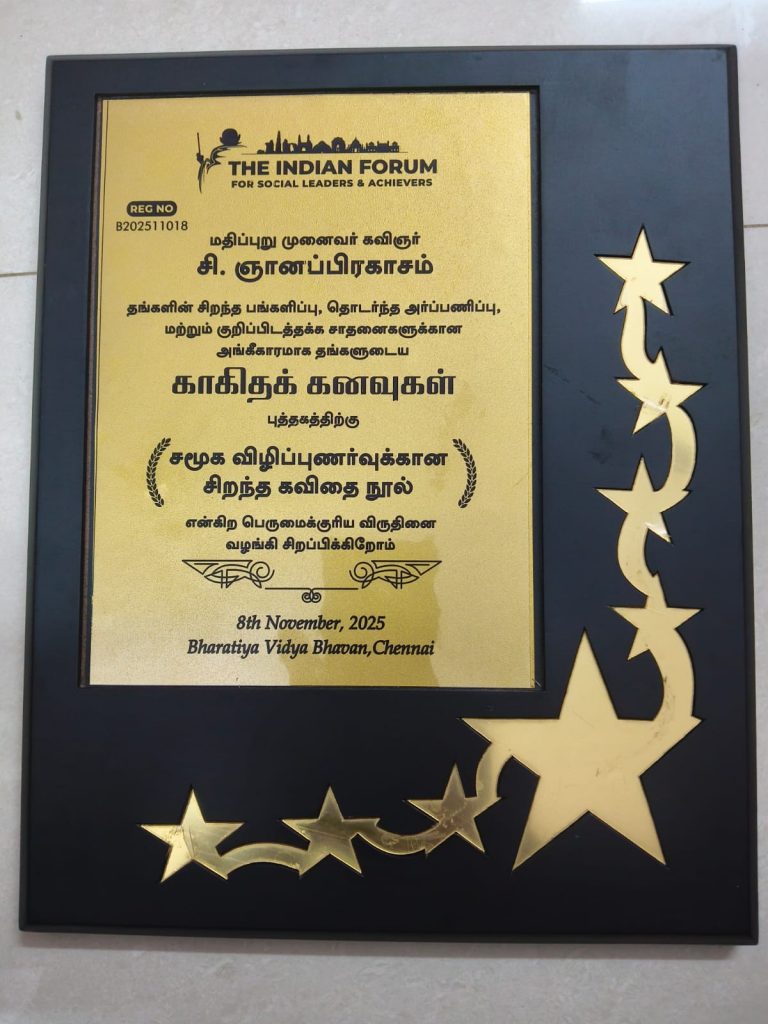 இந்த கவிதை நூல் இந்தியன் ஃபோரம்(INDIAN FORUM) அமைப்பினரால் சமூக விழிப்புணர்வுக்காண சிறந்த கவிதை நூலாக தேர்வு செய்யப்பட்டு விருது வழங்கி கௌரவிக்கப்பட்டது.