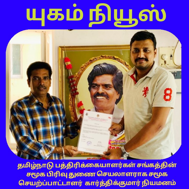 சென்னை :தமிழ்நாடு பத்திரிக்கையாளர்கள் சங்கத்தின் சமூக பிரிவு துணை செயலாளராக சமூக செயற்பாட்டாளரும், சமூக பாதுகாப்பு அமைப்பு மற்றும் லிங்கன் உலக சாதனை புத்தகத்தின் நிர்வாக செயலாளருமான கார்த்திக்குமார் அவர்களை தமிழ் நாடு பத்திரிக்கையாளர்கள் சங்கத்தின் மாநில தலைவர் டி.எஸ்.ஆர்.சுபாஷ் அவர்கள் அதிகார பூர்வமாக அறிவித்து சான்றிதழ் வழங்கி நியமனம் செய்தார்.