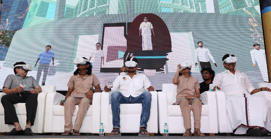 First in the country, the launch of the educational VR Lab took place in a shared 3D virtual environment, called Metaverse, with chief guests: Thiru Udhayanidhi Stalin, MLA, Chepauk-Thiruvallikeni Assembly constituency, Thiru Anbil Mahesh Poyyamozhi, Minister of School Education, Thiru Dayanidhi Maran, Member of Parliament, wearing headsets along with the students, and entering a virtual high-tech school, created exclusively for the event, and inaugurating the lab.