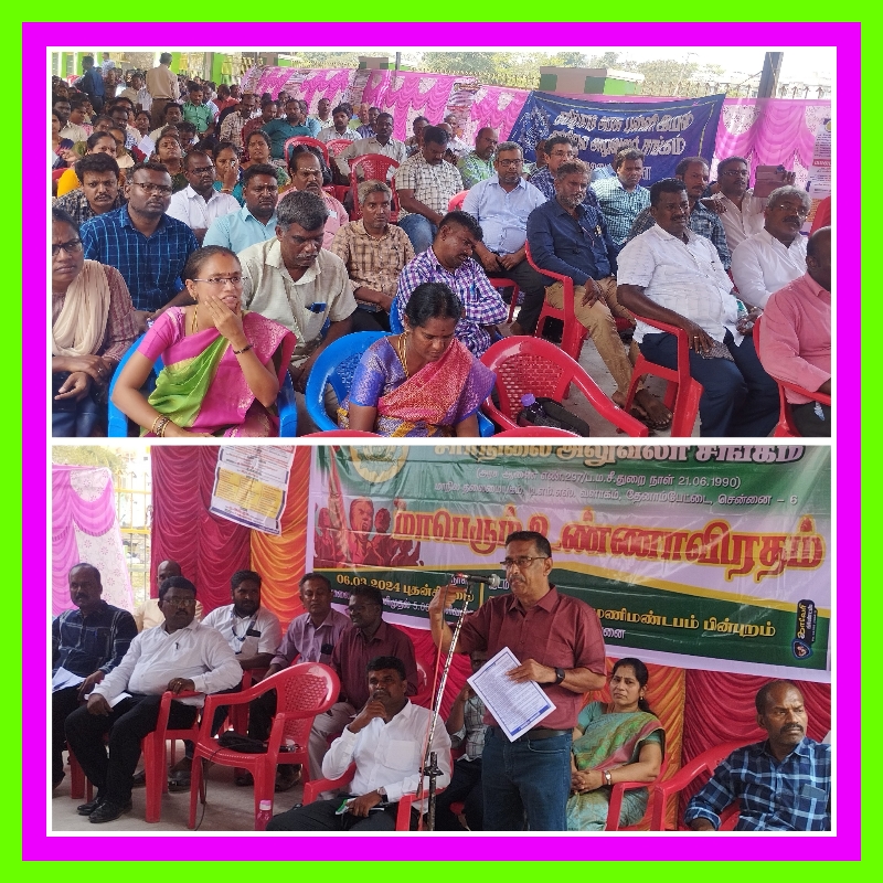 தமிழ்நாடு அரசு பொருள் இயல் மற்றும் புள்ளிஇயல் துறையில் கடந்த மூன்றாண்டுகளாக நிலவும் நிர்வாக சீர்கேடுகளை களைய வேண்டுமென்றும், அலுவலர்கள் மற்றும் சார்நிலை அலுவலர்களுக்கு எதிரான ஒருதலைபட்சமான நடவடிக்கைகளை கைவிடவேண்டும் உள்ளிட்ட கோரிக்கைகளை நிறைவேற்றக்கோரியும் தமிழ்நாடு அரசு நேரடியாக தலையிட்டு துறையின் புள்ளியியல் நிர்வாகத்தினை சீர்படுத்திட வேண்டுமென்பதை வலியுறுத்தியும் சென்னை, காயிதே மில்லத் மணி மண்டபத்திற்கு அருகிலுள்ள மின்சார வாரியத் திடலில் தமிழ்நாடு புள்ளி இயல் சார்நிலை அலுவலர் சங்கத்தின் சார்பில் ஒரு நாள் அடையாள உண்ணாவிரத அறவழி போராட்டம் இச்சங்கத்தின் மாநிலத் தலைவர் ஜே. பால் ஜெயக்குமார் அவர்கள் தலைமையில் நடைப்பெற்றது.