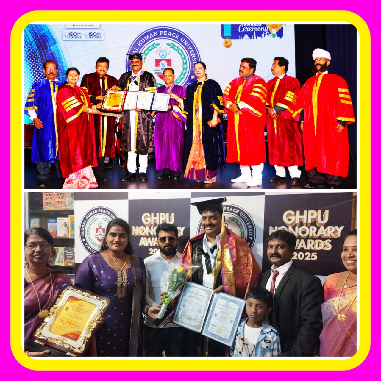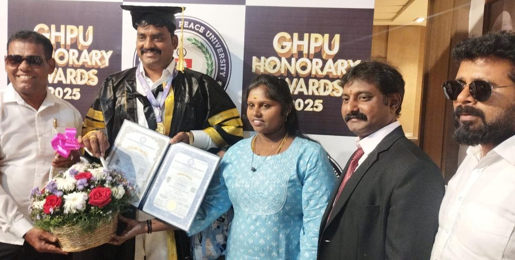 உலகளாவிய மனித அமைதி பல்கலைக்கழகம்(GLOBAL HUMAN PEACE UNIVERSITY)சார்பில் பல்வேறு துறைகளில் சிறந்து விளங்கும் சாதனையாளர்களை கௌரவிக்கும் விதமாக மதிப்புறு முனைவர் பட்டம் வழங்கும் நிகழ்வு சென்னை மயிலாப்பூர் பகுதியிலுள்ள பாரதிய வித்யா பவன் அரங்கில் சிறப்பாக நடைப்பெற்றது.