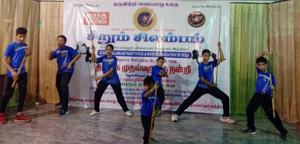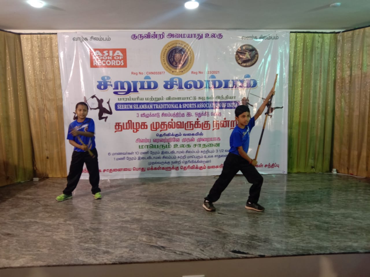 சீறும் சிலம்பம் பாரம்பரிய மற்றும் விளையாட்டு சிலம்பம் கழகம் ஆப் இந்தியா 3 விழுக்காடு சிலம்பத்திற்க்கு இட ஒதுக்கீடு தந்த தமிழக முதல்வருக்கு நன்றி தெரிவிக்கும் வகையில் 6 மாணவர்கள் 10 மணி நேரம் இடைவிடாமல் சிலம்பம் சுற்றியும் 3 வயது சிறுவன் 1 மணி நேரம் இடைவிடாமல் சிலம்பம் சுற்றி மாபெரும் உலக சாதனை படைத்து முதல்வருக்கு நன்றி தெரிவிக்கும் நிகழ்வு பெரம்பூர் லெட்சுமி அம்மன் கோவில் அருகிலுள்ள கமலாம்பாள் திருமண மண்டபத்தில் நடைப்பெற்றது.