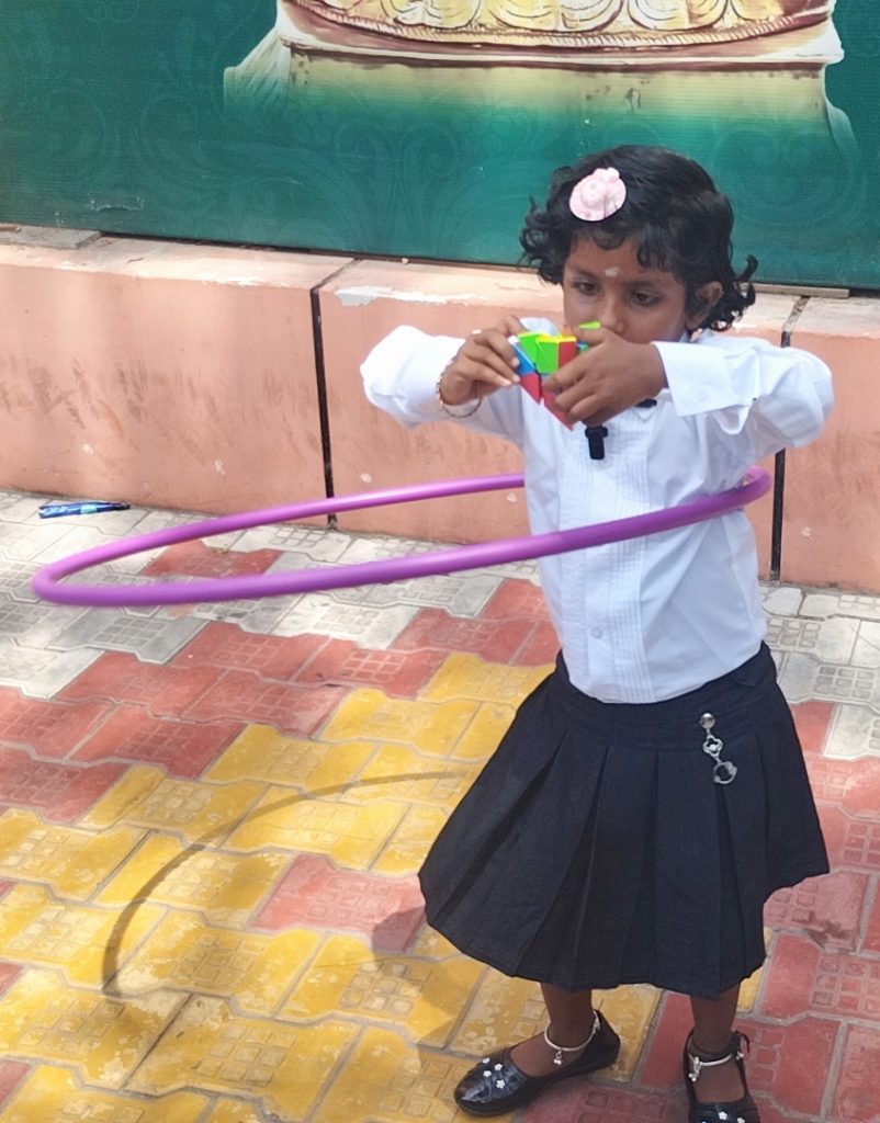 மேலும் அவர் ஹுலா ஹூப்பை (Hulahoop) இடுப்பில் சுற்றுவதுடன், பல்வேறு வகையான கனசதுரங்களை (Rubik’s Cube) தீர்க்கவும் ஒரே நேரத்தில் திருக்குறள்களை சொல்லும் திறனையும் வளர்த்துக்கொண்டார்.