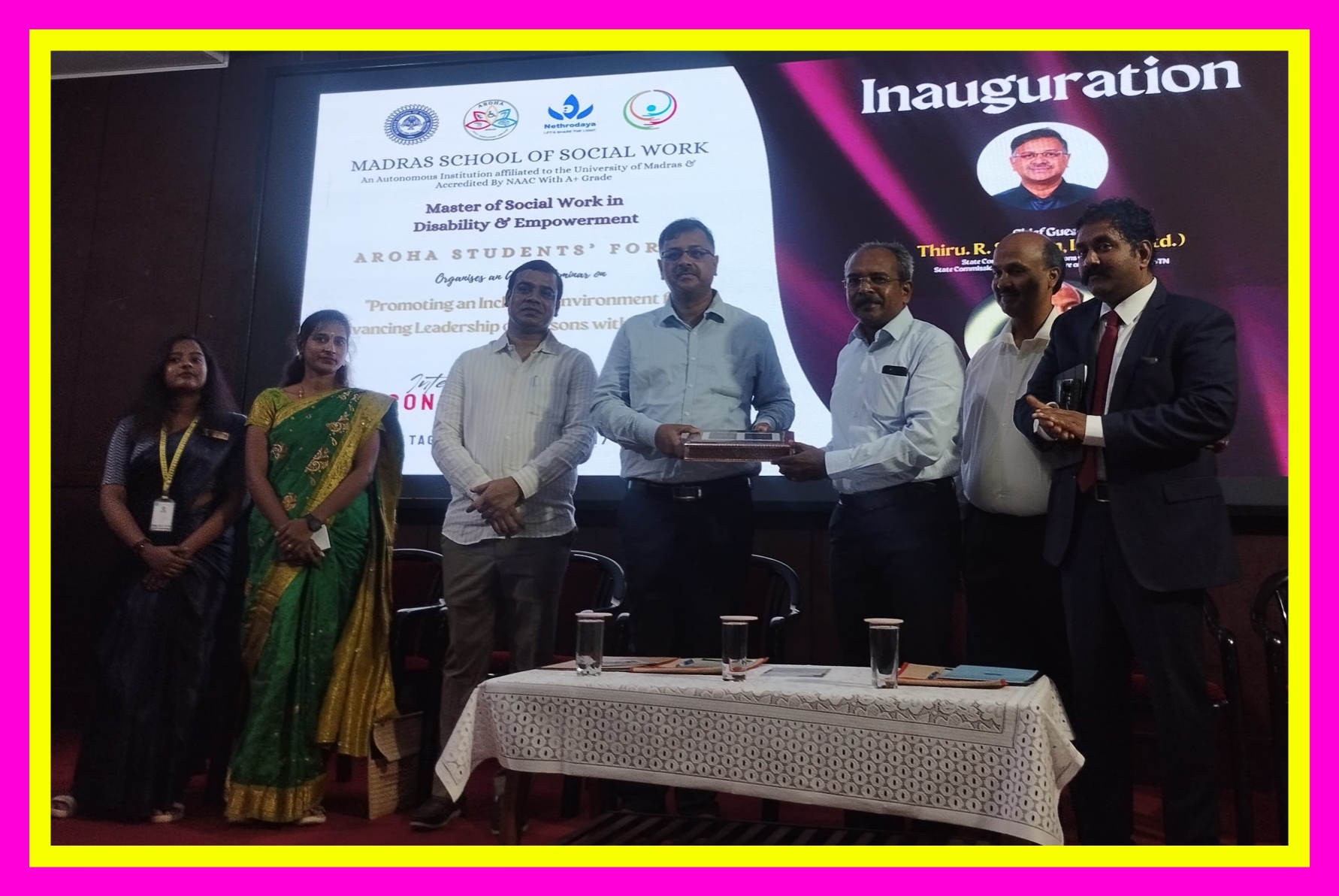 The event was inaugurated by Chief Guest Thiru. Sudhan, I.A.S.(RTD.), State Commissioner for Persons with Disabilities, GoTN, The Guest of Honour Mr. C. Govindakrishnan, Founder of Nethrodaya and Principal of mssw Dr.S. Raja Samuel.