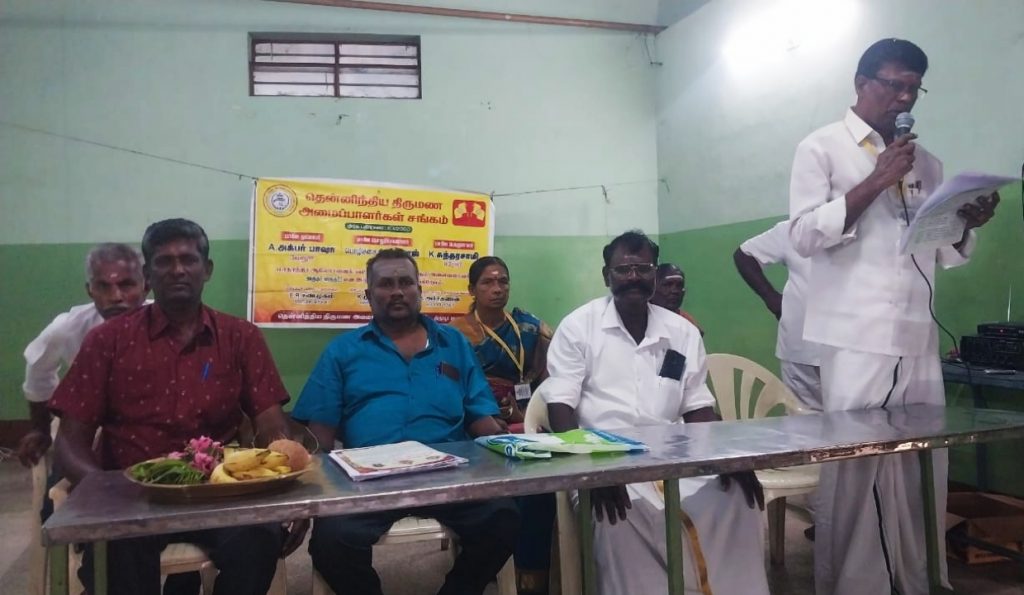 தென்னிந்திய திருமண அமைப்பாளர்கள் சங்கத்தின் திருப்பூர் மாவட்ட மாதாந்திர ஜாதக பரிவர்த்தனை மற்றும் 25வது ஆண்டு விழா குறித்த கலந்தாலோசனை கூட்டம் திருப்பூர் மாவட்டத் தலைவர் மயில்சாமி மற்றும் சண்முகம் ஆகியோர் தலைமையில் திருமுருகன் பூண்டியிலுள்ள அருள்மிகு காமாட்சி அம்மன் அறக்கட்டளை திருமண மண்டபத்தில் சிறப்புற நடைப்பெற்றது.