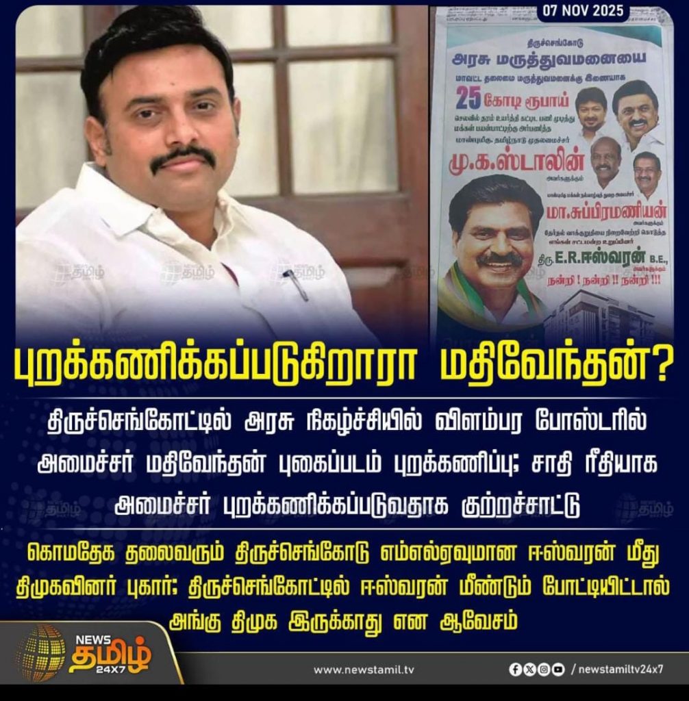 எஸ்ஐஆர் பற்றிய ஆலோசனைக் கூட்டத்திற்கு அழைத்துப் பேசிய திராவிட முன்னேற்ற கழக மாவட்ட தலைமை தமிழ்ப்புலிகள் கட்சியின் நாமக்கல் தொகுதி மாவட்ட செயலாளர் முனைவர் த. குமரவேல் அவர்களை புறக்கணித்தது என்பது பொது மக்களுடைய பிரச்சினைகளை பொதுவெளியில் கொண்டு வந்து போராட்டங்கள் நடத்தியதன் விளைவாக ஆளுகின்ற ஆட்சிக்கு பின்னடைவை சந்திக்கக்கூடிய வேலையை செய்கிறார் என்கிற தவறான புரிதலை கொண்டதன் அடிப்படையிலா? அல்லது பட்டியலின மக்கள் வாழ்ந்து வரக்கூடிய பகுதிகளில் அடிப்படை வசதிகளை கூட தற்போது வரை நாமக்கல் தொகுதிகளில் பெரும்பாலான பகுதிகளில் செய்து கொடுக்க முன்வரவில்லை என்பதை வெளிப்படுத்தியதன் காரணமாக வா.? அல்லது சாதிய பார்வையா…?