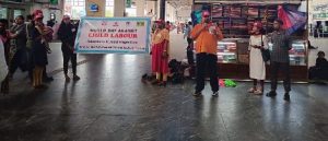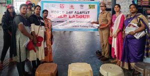 ரெயில்வே போலிசார் குழந்தை தொழிலாளர்கள் பற்றி துண்டு பிரச்சுரம் மூலம் பயணிகள் மற்றும் பொதுமக்களுக்கு விழிப்புணர்வு ஏற்படுத்தினர்.